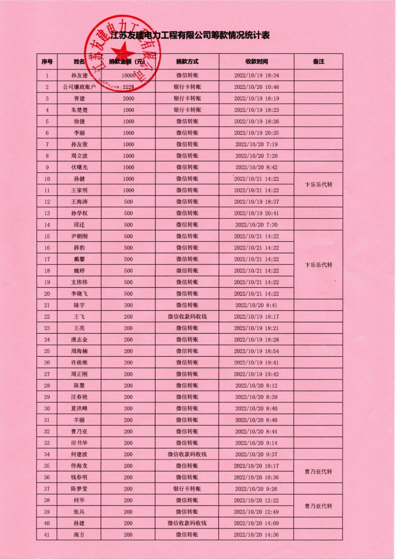 在10月19日《捐款倡议书》的通知发出后,总公司及各子公司积极响应并认真组织本单位职工捐款。截至10月21日,全公司共有126人次爱心捐款,累计筹集资金37481元,其中董事长孙友建捐款10000元,党支部书记、总经理胥建捐款2000元,公司廉政账户捐款2225元,各部门领导纷纷慷慨解囊。充分体现了公司广大职工的仁爱之心。在此,谨向奉献爱心的广大职工表示衷心的感谢!
