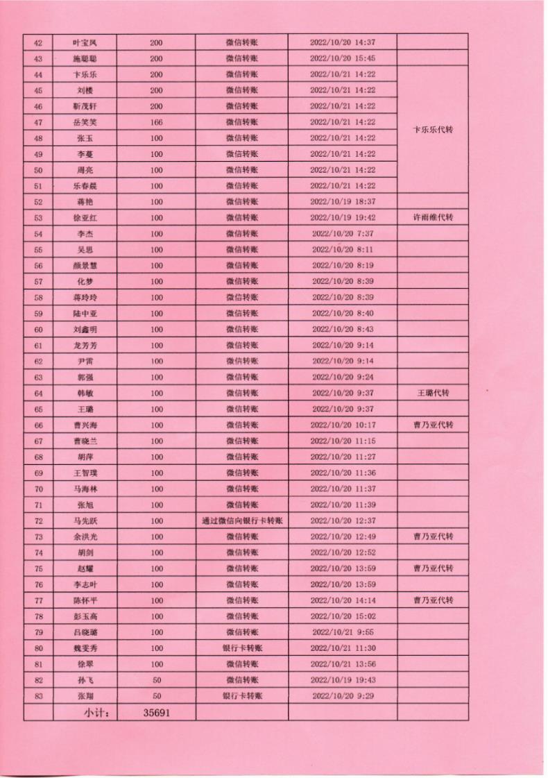 该笔爱心款已于10月21日18时转交到薛某同志手中,现将捐款情况予以公布(具体内容见附表)。